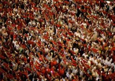 中新網7月15日電 綜合報道,7月15日凌晨,為期9天的盛大的奔牛節(jié)在西班牙北部城市潘普洛納落下帷幕。成千上萬的狂歡者聚集到市政廳前,手舉蠟燭和紅絲巾參加閉幕活動。