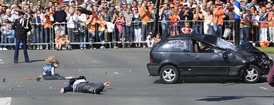 荷蘭中部城市阿珀?duì)柖鄠?月30日舉行“女王日”慶;顒(dòng),荷蘭全國各地每年的這一天都會(huì)舉辦各種慶;顒(dòng)。但就在荷蘭女王貝婭特麗克絲率王室成員乘坐敞蓬大客車參加活動(dòng)時(shí),一輛黑色鈴木小汽車突然從側(cè)面沖進(jìn)舉行游行的街道,導(dǎo)致現(xiàn)場多人被撞死和撞傷,剛剛駛過現(xiàn)場的荷蘭王室成員乘坐的客車沒有受到碰撞。事故發(fā)生后,荷蘭王宮宣布取消女王當(dāng)天所有的活動(dòng)行程,貝婭特麗克絲女王對此事深表震驚,并向死傷者家人表示慰問。荷蘭多個(gè)城市也相繼取消了當(dāng)天“女王日”的慶;顒(dòng)。當(dāng)天有目擊者稱,在轎車失控沖向人群時(shí),司機(jī)趴在方向盤上一動(dòng)不動(dòng),似乎已經(jīng)神志不清。