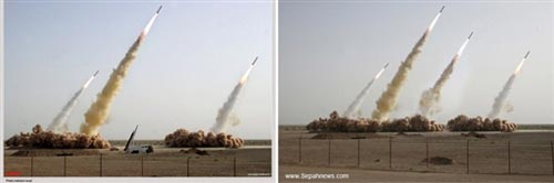 革命衛(wèi)隊(duì)前天向包括以色列在內(nèi)的世界各大傳媒發(fā)放了一批相片和錄像片段,在片段中其中一幕顯示3枚導(dǎo)彈以差不多角度射上天空,第4枚則仍在地上,可能因技術(shù)問題未能發(fā)射。但其中一張相片顯示在類似試射環(huán)境中,竟然多了一枚射上天空的導(dǎo)彈,而且地面的煙塵與最右邊的煙塵極之相似。