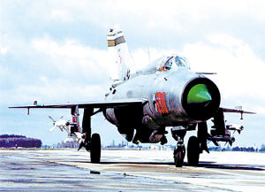 新聞背景 據(jù)美聯(lián)社報(bào)道,2008年底,作為冷戰(zhàn)的一個(gè)象征,在與蘇聯(lián)的主要對(duì)手——北約的對(duì)抗前線服役了50年后,米格-21戰(zhàn)機(jī)行將退役。英國(guó)專業(yè)刊物《空軍月刊》的編輯阿倫·沃恩斯評(píng)論:“在第二次世界大戰(zhàn)之后的歐洲,沒(méi)有任何一種飛機(jī)能像米格-21那樣,對(duì)軍事航空領(lǐng)域產(chǎn)生那么深遠(yuǎn)的影響”。