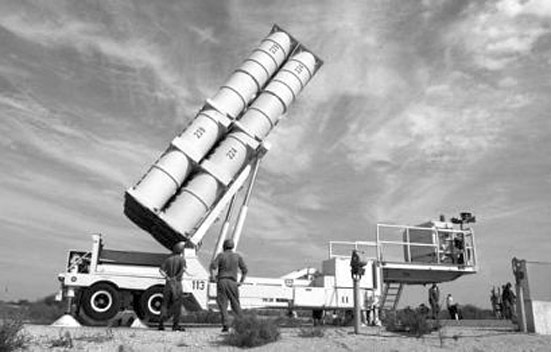 7日,以空軍先是在地中海上空用F-15戰(zhàn)機(jī)發(fā)射了一枚“藍(lán)雀”導(dǎo)彈,用來模擬伊朗“流星-3”彈道導(dǎo)彈,特拉維夫南部的帕爾瑪希姆空軍基地的“箭”式-2型反導(dǎo)系統(tǒng)隨即作出反應(yīng),成功阻截這枚導(dǎo)彈。此次測試是以色列空軍和美國導(dǎo)彈防御局聯(lián)合進(jìn)行的。以國防部長巴拉克坐在一架直升機(jī)上觀看了這次測試。