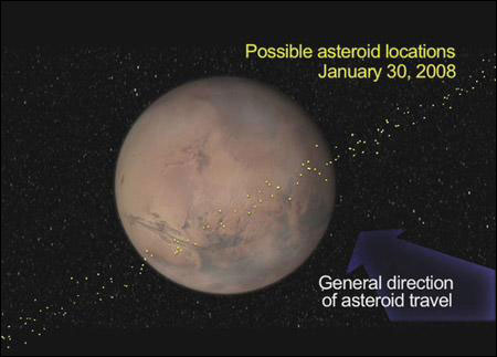 美國宇航局上月21日發(fā)布觀測結果說,一顆名為2007WD5的小行星本月末將穿越火星繞日軌道,其間小行星有可能與火星碰撞。