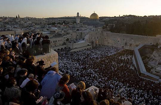 當天哭墻前的廣場上擠滿了披著白色圍巾的男女老幼,周圍的房屋頂上也都人頭攢動,人們在這里等待抓住當天的第一道陽光。