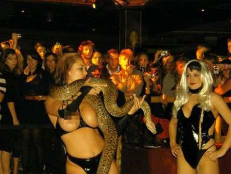 兩名身上涂滿(mǎn)油的表演者裸著上身摔跤,其他人的打扮也很性感,她們穿著用天然乳膠制成的服裝。晚會(huì)的重頭戲是裸著上半身的女郎表演舞巨蟒,一只長(zhǎng)四米的巨蟒爬過(guò)女郎赤裸的胸部和肩部。