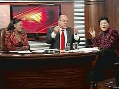 女參選人一臉不屑,故意把水杯碰翻打濕了男議員的膝部,而男士也顧不得風(fēng)度,馬上拿另一杯水迎面還擊,女士臉色氣得發(fā)白。在一旁的主持人震驚地上氣不接下氣。