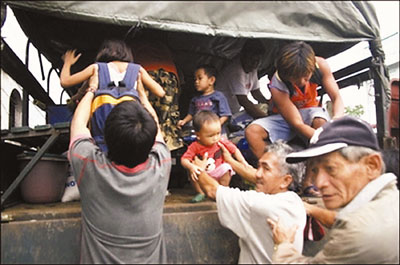 平板貨車(chē)、警方特許客貨車(chē),甚至垃圾車(chē)均被征用接載災(zāi)民離開(kāi)(見(jiàn)圖)?偨y(tǒng)阿羅約夫人縮短新加坡訪問(wèn)回國(guó)。