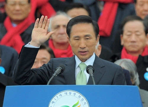 李明博正式宣誓就任韓國總統(tǒng) 萬人參加就職典禮