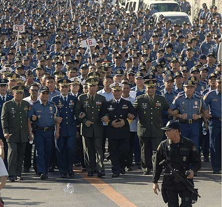據(jù)新加坡《聯(lián)合早報(bào)》報(bào)道,支持阿羅約團(tuán)體也不示弱,將近100名執(zhí)政黨眾議員帶領(lǐng)約1萬人在馬尼拉舉行集會(huì),以示對(duì)阿羅約支持。出席集會(huì)的包括阿羅約兩名當(dāng)眾議員的兒子。而反政府團(tuán)體約2萬名成員兵分三路,分別在總統(tǒng)府附近的孟迪奧拉橋、具歷史性意義的埃剎圣壇和一個(gè)教堂舉行示威和祈禱集會(huì),要求阿羅約辭職。
