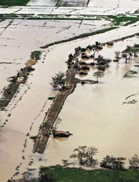 重災(zāi)區(qū)博葛禮已有逾1萬人死亡,95%屋子被摧毀,19萬人無家可歸。緬甸軍政府指,風速達190公里的“納爾吉斯”卷起3.5米高巨浪,沖走低洼地區(qū)村落半數(shù)房屋,大量災(zāi)民在巨浪中溺斃。美國宇航局衛(wèi)星圖片顯示,緬甸西南部沿海平原完全被水淹沒。聯(lián)合國稱,受災(zāi)人口約2400萬人,接近全國一半人口。