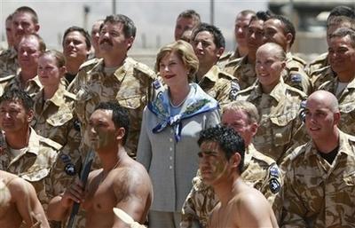中新網(wǎng)6月0日電 美國(guó)第一夫人勞拉-布什8日突然造訪阿富汗慰問駐軍,勞拉這次前往新西蘭負(fù)責(zé)的重建區(qū)域,新西蘭士兵還大跳毛利人的戰(zhàn)舞歡迎勞拉。與布什看舞蹈會(huì)跟著擺動(dòng)身軀相比,勞拉相對(duì)之下就冷靜得多。