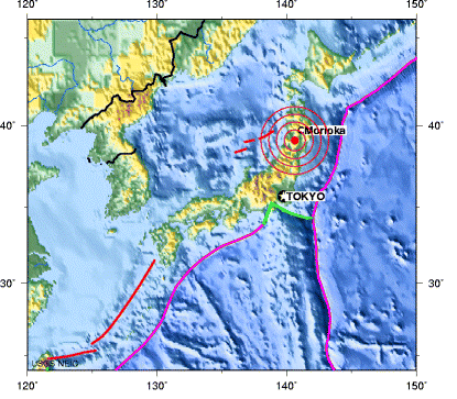 日本里氏7.0級(jí)強(qiáng)烈地震示意圖。