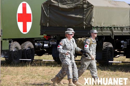 9月4日,在蒙古國(guó)首都烏蘭巴托以西65公里處的蒙古國(guó)武裝力量培訓(xùn)中心,參加多國(guó)維和演習(xí)的美軍醫(yī)療隊(duì)員從軍車旁經(jīng)過。