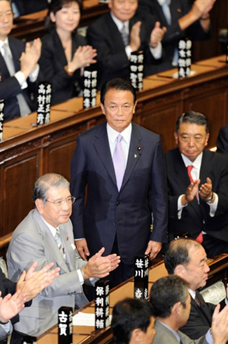 當(dāng)?shù)貢r(shí)間24日13點(diǎn)30分,兩天前剛剛當(dāng)選自民黨總裁的麻生太郎在眾議院全體會(huì)議上以337票被指定為第92任日本總理大臣。參議院隨后召開(kāi)全體會(huì)議進(jìn)行首相提名選舉,民主黨黨首小澤一郎當(dāng)選。根據(jù)眾院表決結(jié)果優(yōu)先的日本憲法規(guī)定,麻生太郎經(jīng)兩院協(xié)商后確定出任首相。
