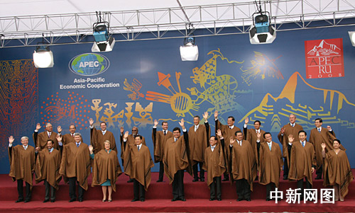 中午,與會各成員領(lǐng)導(dǎo)人身穿秘魯民族服裝集體合影。