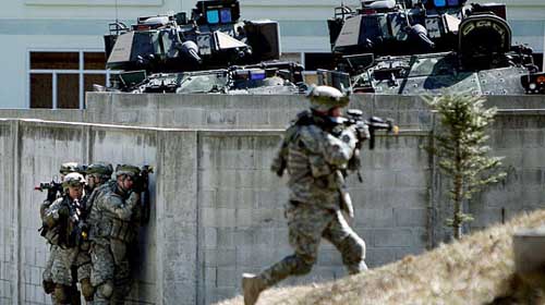 中新網(wǎng)3月11日電 據(jù)韓國(guó)《中央日?qǐng)?bào)》報(bào)道,10日是韓美“關(guān)鍵決斷(key resolve)”聯(lián)合軍事演習(xí)的第二天,京畿道抱川駐韓美軍羅德里格斯(Rodriguez)射擊場(chǎng)上,韓美海軍展開(kāi)巷戰(zhàn)訓(xùn)練。美軍士兵正朝著假想敵軍占領(lǐng)的建筑物前進(jìn)。
