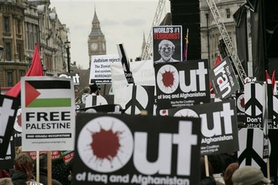 “停止戰(zhàn)爭(zhēng)聯(lián)盟”發(fā)言人表示:“伊拉克被占領(lǐng)的結(jié)果,是估計(jì)導(dǎo)致100萬(wàn)人死于暴力!彼提到阿富汗戰(zhàn)事,指布朗不斷增兵阿富汗,可能成為另一場(chǎng)像伊拉克的災(zāi)難。格拉斯哥亦有幾百名示威者高舉“撤出伊拉克和阿富汗”的標(biāo)語(yǔ)牌。