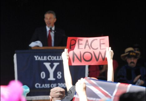 布萊爾在抵達(dá)耶魯大學(xué)遇到了一小群示威者,他們揮動著寫有“對布萊爾說不”、“耶魯!不要支持一名戰(zhàn)犯”的標(biāo)語牌,警方?jīng)]有讓這些示威者進(jìn)入講演會場。講演是在一個有門的大花園內(nèi)進(jìn)行的。但當(dāng)54歲的布萊爾走上主席臺時,一些學(xué)生展示了紅色的標(biāo)語,上面寫著“現(xiàn)在就實現(xiàn)和平”、“不要戰(zhàn)爭”。學(xué)生是將這些標(biāo)語放在畢業(yè)袍里帶進(jìn)會場的。一名戴著頭巾的女學(xué)生在布萊爾講演時一直站著,她在距布萊爾約3米遠(yuǎn)的地方舉著“現(xiàn)在就要和平”的標(biāo)語。布萊爾看起來非常努力地不去看那名女學(xué)生。布萊爾在講演時也未直接提到伊拉克,他在講演時談到了氣候變化的問題、由宗教加劇的恐怖主義。布萊爾將于明年在耶魯大學(xué)開信仰和全球化課程。