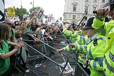 示威者曾計劃游行到唐寧街,但警察封鎖了通往首相府的白廳街道,并派重兵把守,以確保他們搭設的金屬路障不會受到?jīng)_擊。