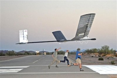 據(jù)香港《文匯報(bào)》報(bào)道,這架名為“Zephyr(微風(fēng))”的無人偵察機(jī),由英國國防公司Qinetiq制造。“Zephyr”機(jī)身由碳纖維制造,只重30公斤,飛行高度達(dá)6萬英尺,時(shí)速可達(dá)112公里,能抵受攝氏45度至零下75度的溫差!癦ephyr”60英尺(18米)長機(jī)翼上的太陽能充電板,能為它提供源源不絕的能源。