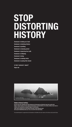 網(wǎng)民們還選定了廣告內(nèi)容。Daum從4日至12日,在網(wǎng)站公布了某廣告公司免費制作的三個廣告試案,并征求眾網(wǎng)民意見。結果,58.6%的網(wǎng)民選擇了“STOP DISTORTING HISTORY(停止歪曲歷史)”這一廣告文案。