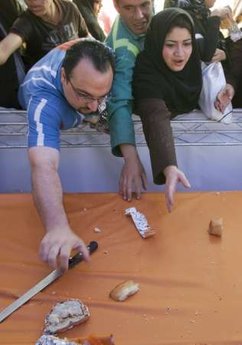 中新網(wǎng)10月19日電 據(jù)臺(tái)灣中廣新聞報(bào)道,伊朗做出刷新世界紀(jì)錄的特大號(hào)三明治,可是還來(lái)不及完成認(rèn)證,就被圍觀的群眾搶食一空。