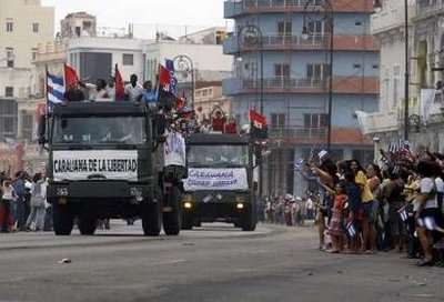 在厄瓜多總統(tǒng)柯雷亞的陪同下,古巴領(lǐng)導(dǎo)人、卡斯特羅之弟勞爾-卡斯特羅參加了在一處前軍事基地舉行的慶祝典禮。這處軍營是卡斯特羅在1959年1月8日抵達(dá)哈瓦那后,向成千上萬歡欣鼓舞的古巴人發(fā)表演說的地點。