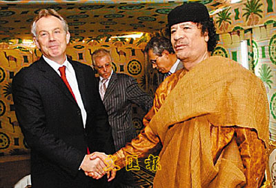 據(jù)香港《文匯報(bào)》報(bào)道,布萊爾在2004年3月到訪的黎波里,不但與利比亞領(lǐng)袖卡扎菲進(jìn)行歷史會(huì)晤,雙方還達(dá)成協(xié)議,讓英國(guó)調(diào)查員到當(dāng)?shù)卣{(diào)查1984年發(fā)生在英國(guó)大使館的一宗槍殺案。期間,卡扎菲把駱駝座鞍贈(zèng)送給布萊爾以示友好,更象征著英國(guó)把利比亞重新帶返國(guó)際社會(huì)。