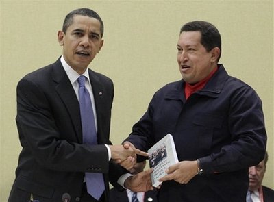 據(jù)香港《明報(bào)》報(bào)道,查韋斯和奧巴馬在西班牙港出席美洲國家首腦會(huì)議,二人于17日首次握手問候,18日在會(huì)談前雙方再次握手,奧巴馬用西班牙語向查韋斯問候,查韋斯則贈(zèng)送給奧巴馬一本烏拉圭作家愛德華多.加萊亞諾的名著《拉丁美洲:被切開的血管》。
