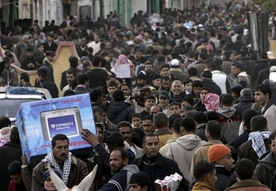據(jù)“中央社”報(bào)道,埃及邊境衛(wèi)隊(duì)并未采取行動(dòng)。埃及總統(tǒng)穆巴拉克說,他告訴邊界官員,“讓他們(加沙人)進(jìn)來,找東西吃或是購(gòu)買食物,只要他們沒帶武器,就讓他們回去”。興高采烈的加沙人民涌向埃及邊界的拉法鎮(zhèn),購(gòu)買香煙、燃料,以及其它因?yàn)楫?dāng)?shù)剡B月遭到封鎖而變得稀有的物品。
