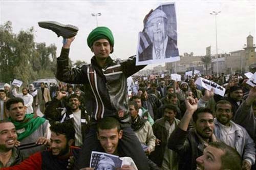納杰夫地區(qū)的一名示威者用鞋子拍打美國總統(tǒng)布什的畫像。