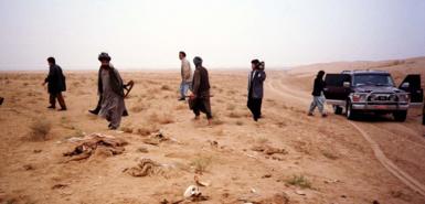 這個(gè)位于阿富汗北部達(dá)累沙漠的“萬人坑”,據(jù)說曾有1000到2000名塔利班戰(zhàn)俘遺骸。這些人是在2001年11月份,被忠于烏茲別克軍閥阿卜杜拉·拉希德·杜斯塔姆的武裝人員屠殺的。當(dāng)時(shí),杜斯塔姆將軍配合美國(guó)特種部隊(duì)?wèi)?zhàn)斗,追擊塔利班武裝。這些塔利班戰(zhàn)俘被塞進(jìn)密封的集裝箱,很多人窒息而死,另外一些戰(zhàn)俘被裝入箱子后,武裝分子用機(jī)槍瘋狂掃射,然后將尸體連同箱子一同焚化。