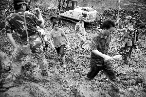 負(fù)責(zé)挖掘的武警交通直屬工程部的周偉表示,為了確保安全,避免次生災(zāi)害,大型挖掘機(jī)的挖掘工作到下午四點(diǎn)左右才開始。他說,為了保證遺體的完整,他們挖掘的時候都會非常小心。在現(xiàn)場,由于垮塌的直線距離幾百米,幾臺挖掘機(jī)分層次挖掘。挖出一大鏟泥土后,從高處落下,看是否有遺體存在。