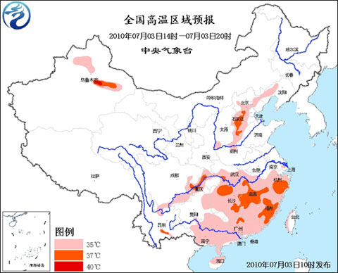 中新網(wǎng)7月3日電 中央氣象臺3日10時發(fā)布高溫黃色預(yù)警:預(yù)計,今日下午,江淮西南部、江漢南部、江南大部、華南大部、貴州東部、重慶大部、四川東部和南部、云南東北部等地有35~37℃、局地38~40℃的高溫天氣。另外,遼寧西部、北京中南部、河北大部、山西西南部、河南北部等地的部分地區(qū)也將有35~37℃、局地38~39℃的高溫天氣。