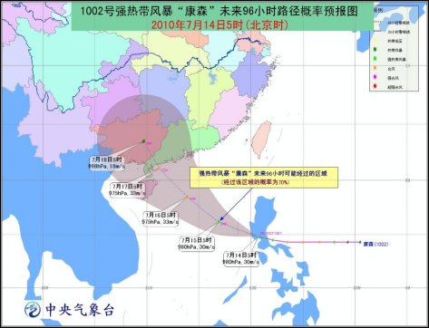 中新網(wǎng)7月14日電 據(jù)中央氣象臺(tái)最新消息,“康森”昨天夜間23時(shí)前后在呂宋島東南部沿海登陸,登陸時(shí)中心附近最大風(fēng)力有11級(jí)(30米/秒),目前減弱為強(qiáng)熱帶風(fēng)暴,今天凌晨5時(shí)“康森”中心位于呂宋島南部地區(qū)(北緯14.8度,東經(jīng)120.7度)。