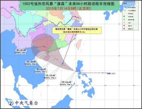 中新網(wǎng)7月14日電 中央氣象臺(tái)今天10時(shí)發(fā)布的臺(tái)風(fēng)黃色預(yù)警稱:今年第2號(hào)強(qiáng)熱帶風(fēng)暴“康森”的中心已于今天上午8時(shí)由菲律賓呂宋島西南部移入中國南海東部海面,9時(shí)其中心距海南省文昌市東南方大約1090公里(北緯14.8度、東經(jīng)119.8度),中心附近最大風(fēng)力有10級(jí)(28米/秒),中心最低氣壓985hPa。