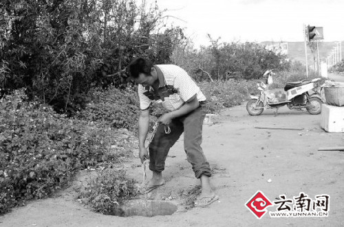 昨日下午,蒙自縣文瀾鎮(zhèn)高家寨的戴橋紅,正拎著一只水桶在紅河大道上找水,他找水的地方是紅河大道上的排污管道。在紅河大道的非機(jī)動(dòng)車(chē)道上,許多窨井蓋都不見(jiàn)了,紅河大道兩旁的果農(nóng)們,每天都會(huì)開(kāi)著車(chē)或者騎著摩托來(lái)找水。