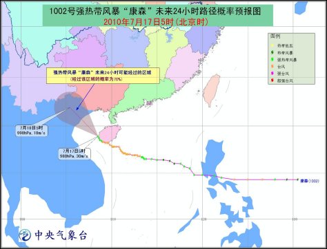 今年第2號臺風“康森”的中心已于16日19時50分在海南省三亞市沿海登陸,登陸時中心附近最大風力有12級(35米/秒),中心最低氣壓為968百帕。17日凌晨2時“康森”在海南樂東近海減弱為強熱帶風暴,4時前后進入北部灣海面,5時其中心位于北緯18.9度、東經(jīng)108.5度的海面上,中心附近最大風力有11級(30米/秒),中心最低氣壓為980百帕。