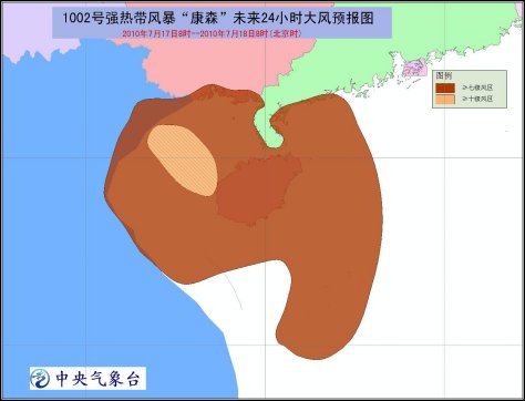 受其影響,17日白天到夜間,南海西北部、瓊州海峽、海南省及其沿海、廣東西部沿海、廣西沿海、北部灣將有7~9級大風,“康森”中心經(jīng)過的附近海面的風力可達10~12級,北部灣部分海域陣風可達13~14級;廣東西南部、廣西南部、海南、云南東南部將有大到暴雨,其中海南西部、廣西南部的部分地區(qū)有大暴雨。