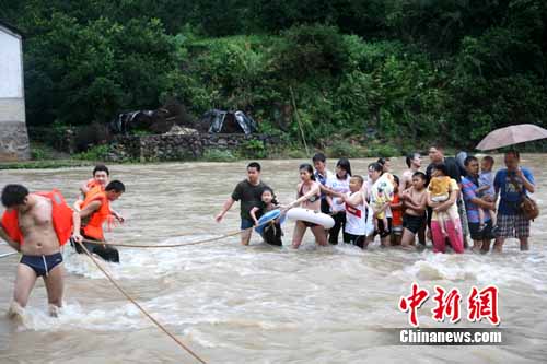 中新網(wǎng)衢州7月18日電(記者 江耘 通訊員 饒小飛)今天下午,浙江衢州石梁鎮(zhèn)坎底村水庫因暴雨致水位突漲,18名正在水庫里休閑渡假的游客被困水庫中央,其中7人是小孩。后在衢州柯城消防架設(shè)“安全通道”下,18名游客被安全救出。