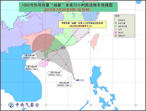 位于南海中部的熱帶低壓于19日晚上加強為今年第3號熱帶風暴“燦都”,20日5時風暴中心位于廣東陽江東南方大約720公里的海面上,就是北緯16.7度,東經(jīng)116.2度,中心附近最大風力有8級(18米/秒),中心最低氣壓為1000百帕。