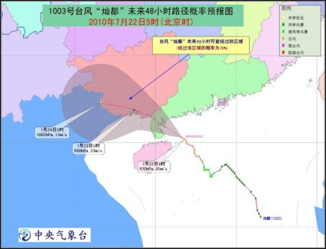 中新網(wǎng)7月22日電 據(jù)中央氣象臺消息,攜風帶雨,“燦都”的腳步正一步步逼近,中央氣象臺今日凌晨繼續(xù)發(fā)布臺風橙色預警,預計今日中午前后“燦都”將在廣東徐聞到電白一帶沿海登陸。華南沿海“嚴陣以待”、即將接受一場狂風暴雨的考驗。另外,前期降水較強的東北地區(qū)雨勢將有所緩和。