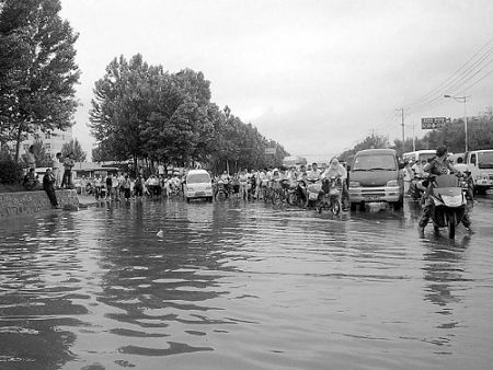 到了萬芳廣場前,路面積水深達半個車輪,一些馬力不夠的小轎車不敢再開,或停在路邊等候,或鉆進小胡同,只有大貨、吉普敢一試深淺。在四臺子檢車線附近,向北車輛在此被分流。本報采訪車苦行近2個小時,終于到達堵車源頭——公鐵橋。
