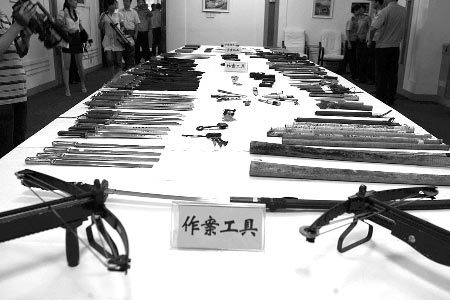 現(xiàn)場(chǎng)最多的作案工具還是刀,三尺長(zhǎng)一掌寬的板刀、砍刀約40把,大小匕首近50把。在刀具旁邊擺著兩把弩,民警介紹說(shuō),弩的裝填時(shí)間很長(zhǎng),攜帶也不方便,但是它的射程很遠(yuǎn),殺傷力強(qiáng),“在利益沖突比較嚴(yán)重的時(shí)候,曾有黑惡勢(shì)力團(tuán)伙用弩對(duì)射”。