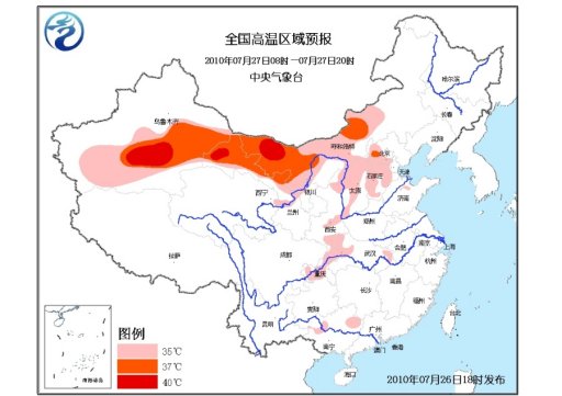 中央氣象臺(tái)26日繼續(xù)發(fā)布高溫藍(lán)色預(yù)警。預(yù)計(jì),27日白天,北京南部、河北中西部、山西大部、陜西東部、寧夏北部、重慶大部、湖北西北部和東南部、廣西中部等地有35℃以上的高溫天氣,局地最高氣溫可達(dá)37~38℃。