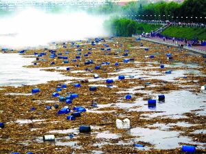 記者下午在吉林市城區(qū)內(nèi)的一處松花江段看到,江面上漂浮著幾十個(gè)藍(lán)色的原料桶,江邊異常的氣味不太明顯。