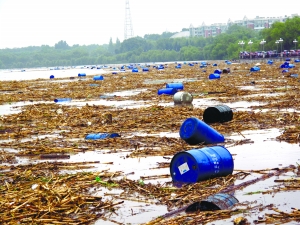 大量藍(lán)桶冒白煙漂江面