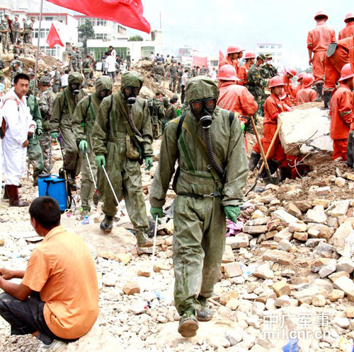 防化團(tuán)政委張貴泉說,發(fā)現(xiàn)遇難者遺體后,遺物必須逐人逐件進(jìn)行消毒,工作進(jìn)展一步,消毒一步,發(fā)現(xiàn)一具,消毒一具,同時(shí)對整個(gè)災(zāi)區(qū)的地面、空氣進(jìn)行消毒。