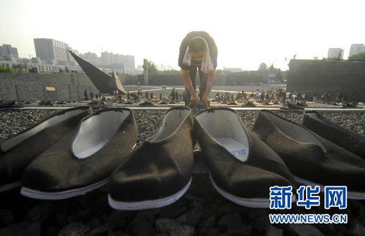 為了紀(jì)念二戰(zhàn)期間在日本遇害的6830名被強擄的中國勞工,14日下午,被擄勞工中的幸存者及遇難者家屬、日本友人等近50人在南京舉行了6830雙布鞋擺放活動。