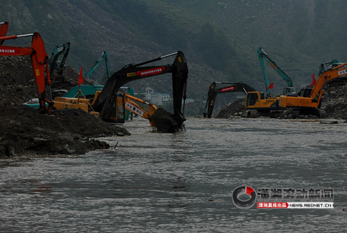 隨著入口擴(kuò)大,搶險隊(duì)伍同時在岷江右岸(改道后的河道)鋪設(shè)了一條150米長的進(jìn)站道,以利重型機(jī)械通過,并準(zhǔn)備在明后天對改道后的岷江河道進(jìn)行截流。