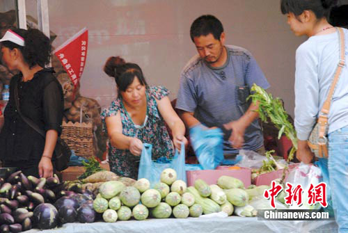 中新網(wǎng)舟曲8月20日電 (記者 侯志紅) “從14日下午開始我們我們已經(jīng)有蔬菜上市了,但目前因道路受到限制,疏菜運輸還比較困難,因此, 疏菜成了舟曲居民的搶手貨!敝矍h政府附近一位菜灘的女老告訴記者。